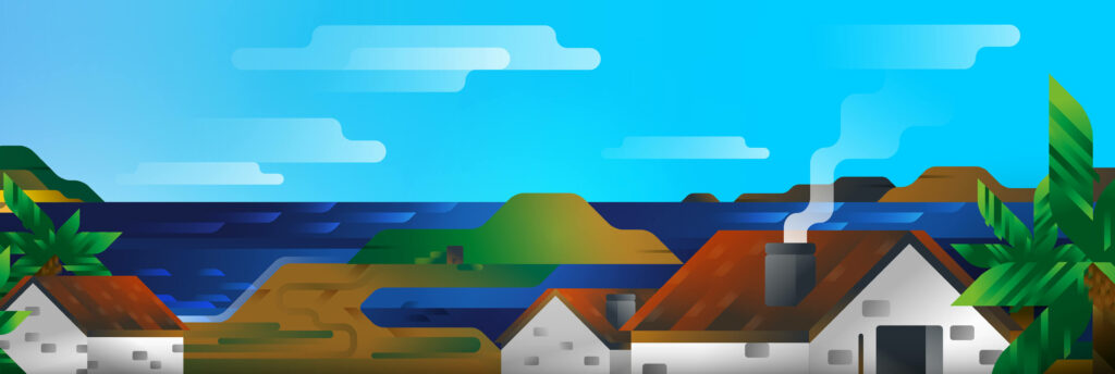 Leaving Las Palmas and following the coast towards the south, we reach another coastal landscape in a few kilometers, located on the east side of the island. What you can see in this second illustration is a typical Canarian landscape, a view of the Gando’s peninsula with the typical colonial houses of the municipality of Telde. This promontory, on the side of Gran Canaria, is important from the historical point of view as it represented the starting point for the conquest of the island by the Spanish Crown. The conquerors built the first vanguard tower, which soon became a shelter to face the indigenous peoples of the island and pirates. Today, facing this landscape, there is the only airport of Gran Canaria, better known as “Aeropuerto del Gando”; the peninsula was used for a period as a leper hospital and now it’s occupied by a military base, just next to the airport.