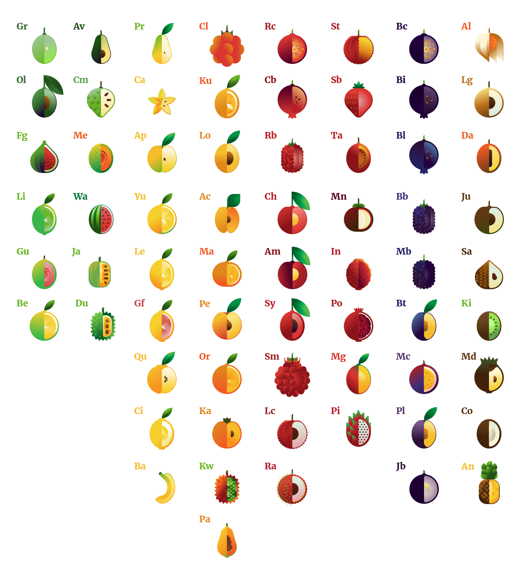 Grape fruit icon, family, species and names, illustration by Francesco Faggiano, project by Isleta Design Studio