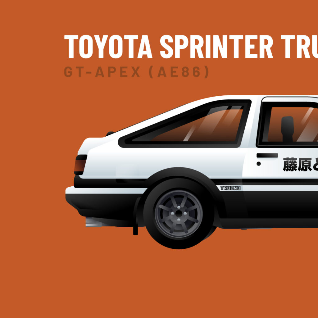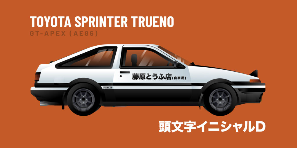 Takumi Fujiwara’s Toyota Sprinter Trueno GT-APEX (AE86), also known as The White Ghost of Akina, the Panda Trueno, or more simply as the Eight-Six (Hachi-Roku), is one of the main vehicles in the Initial D series.